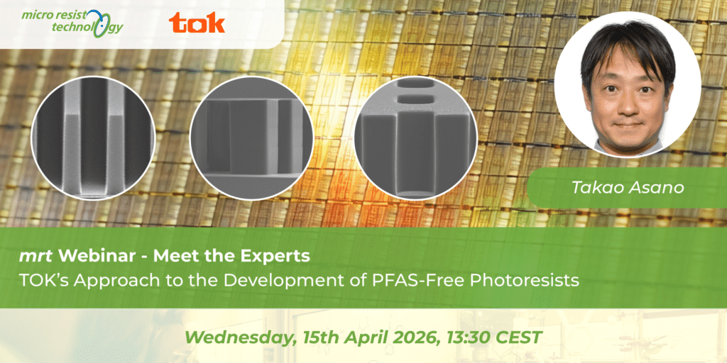 Tokyo Ohka Kogyo Co., LTD. (TOK), ein führender Hersteller von lichtempfindlichen Photoresists, unterstützt die Entwicklung verschiedener Industriezweige durch Technologien des Polymerdesign, der Mikrofertigung und für hochreine Chemikalien. Als Mitglied der TOK-Gruppe bietet micro resist technology auch Produkte von TOK für europäische Kunden an.